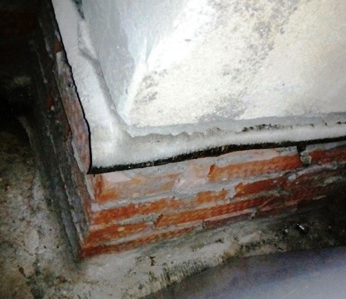 Наружные стены фундамента, опирающиеся на ж/б фундаментную плиту, выполнены из красного кирпича – это не лучший материал для подземной части фундамента. Однако, после 6-летней эксплуатации дома состояние кирпичной кладки остается хорошей, что говорит о высоком качестве примененного кирпича и дает основание надеяться на достаточную долговечность этой части фундамента: